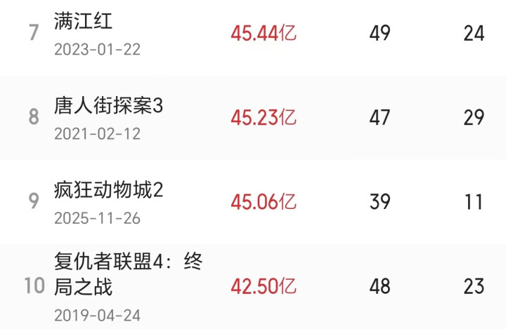 据国内的电影平台所显示,《疯狂动物城2》的内地总票房已经突破了45亿人民币,在中国影史票房榜中暂列第九名,比处于第十的《复仇者联盟4》多出了2.5亿人民币,并开始对第八名的《唐人街探案3》和第七名的《满江红》发起挑战。