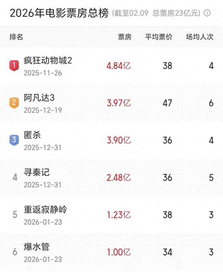 从1月1日第一天到现在,共一个多月的时间,我们中国内地年度大盘23亿人民币,《疯狂动物城2》以近5亿人民币的成绩稳列第一,其次是詹姆斯卡梅隆的《阿凡达3》(年度票房不到4亿人民币),位列第三的则是《匿杀》(年度票房3.9亿人民币),再之后是《寻秦记》(年度票房2.48亿人民币)。
